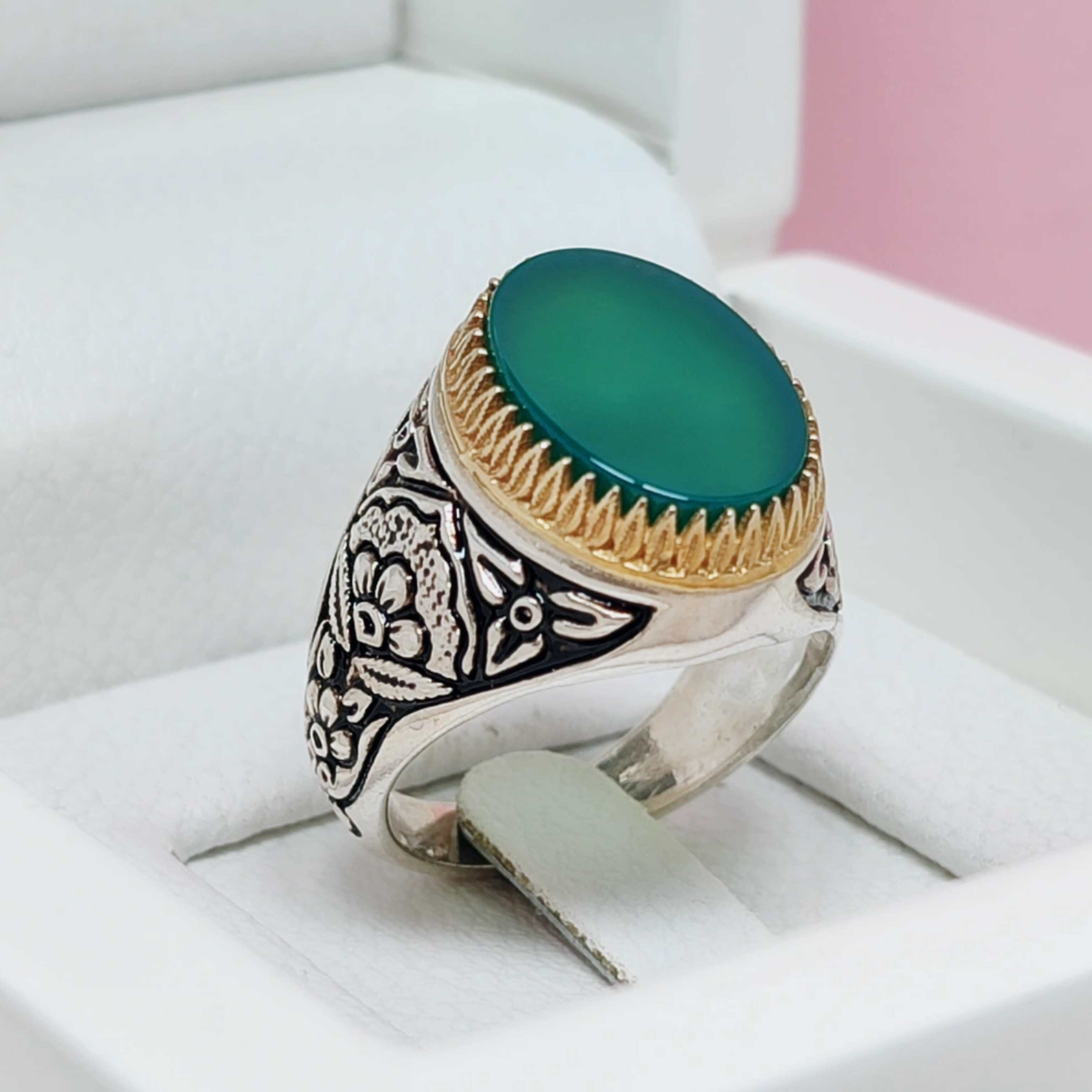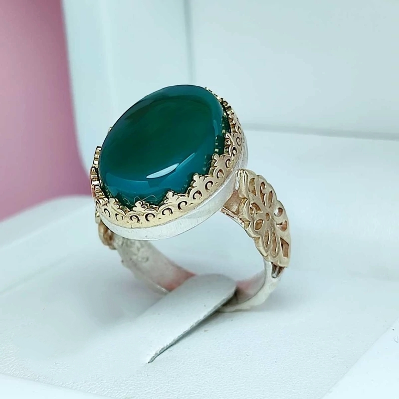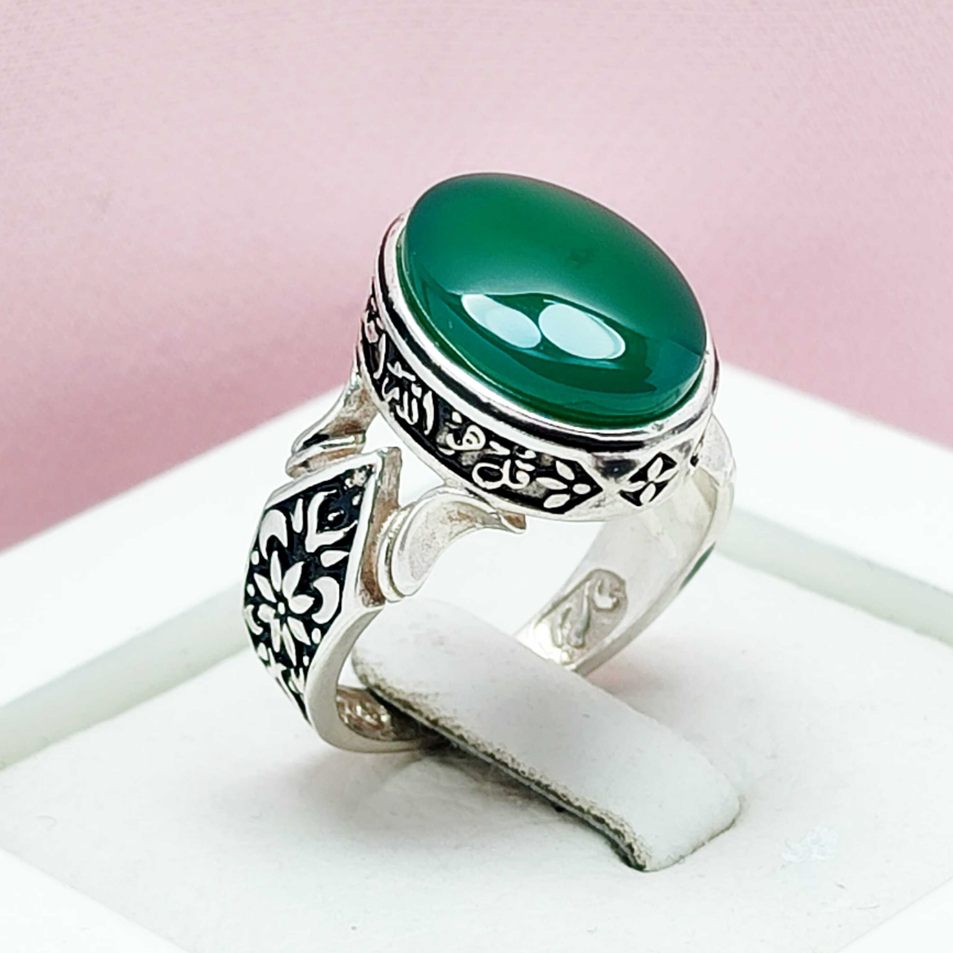 انگشتر عقیق سبز رنگ رکاب طرح گل