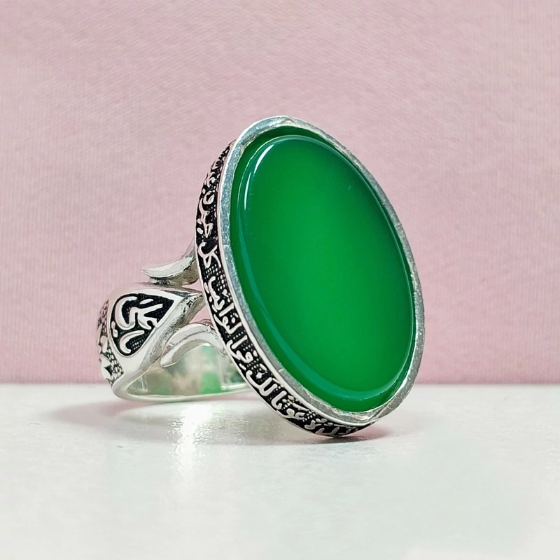 انگشتر مردانه عقیق سبز با رکاب نقره یاعلی ذکر یا اباالفضل