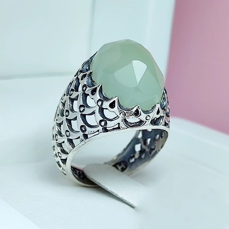 انگشتر مردانه نقره عقیق سبز تیره درشت تراش دار