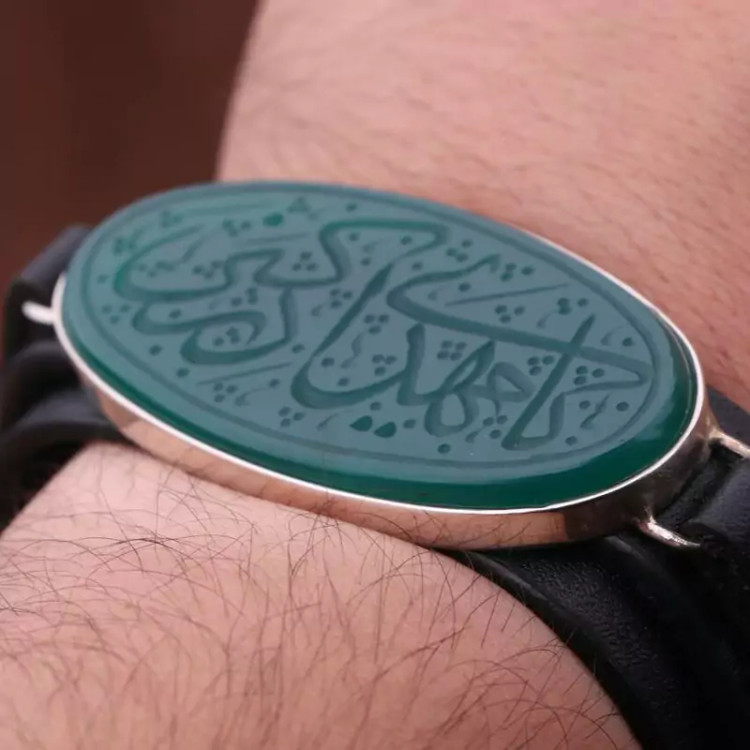 دستبند چرم طبیعی عقیق سبز نقش یامهدی ادرکنی اصل ( دستبند مردانه )