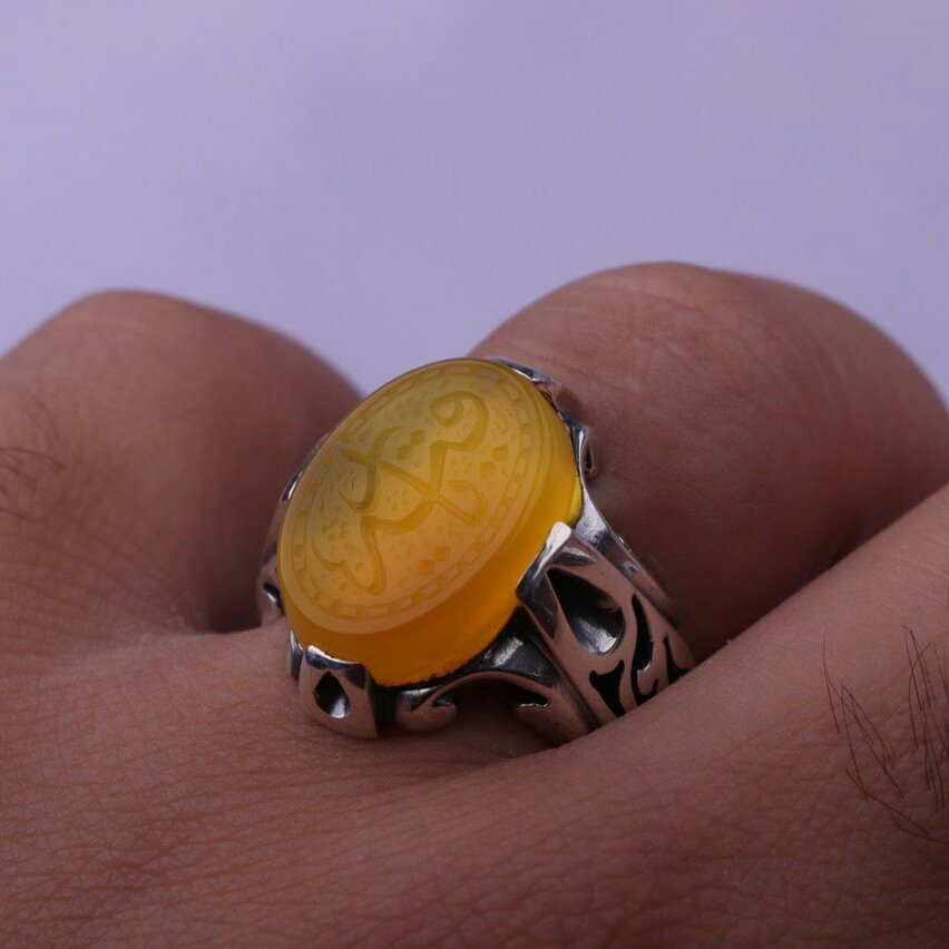 نگین انگشتر عقیق زرد اصل است که با نقش یارقیه متبرک کشته است.