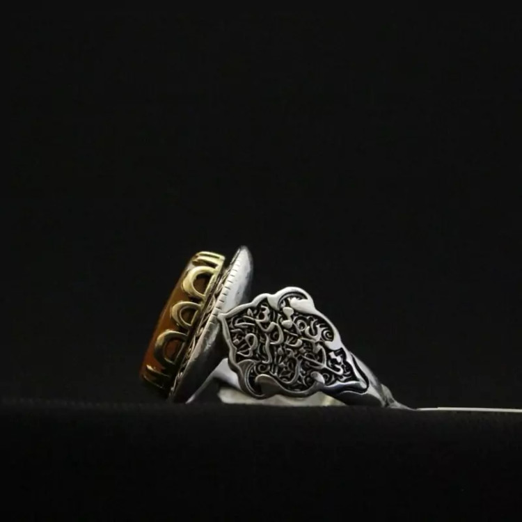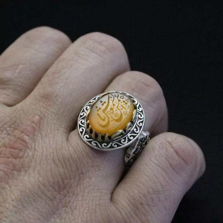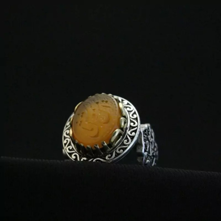 انگشتر عقیق زرد رکاب تاج برنجی نقش یاشمس الشموس اصل ( انگشتر مردانه )