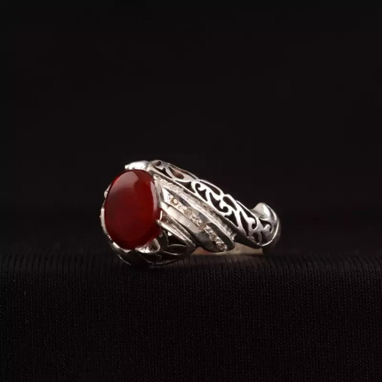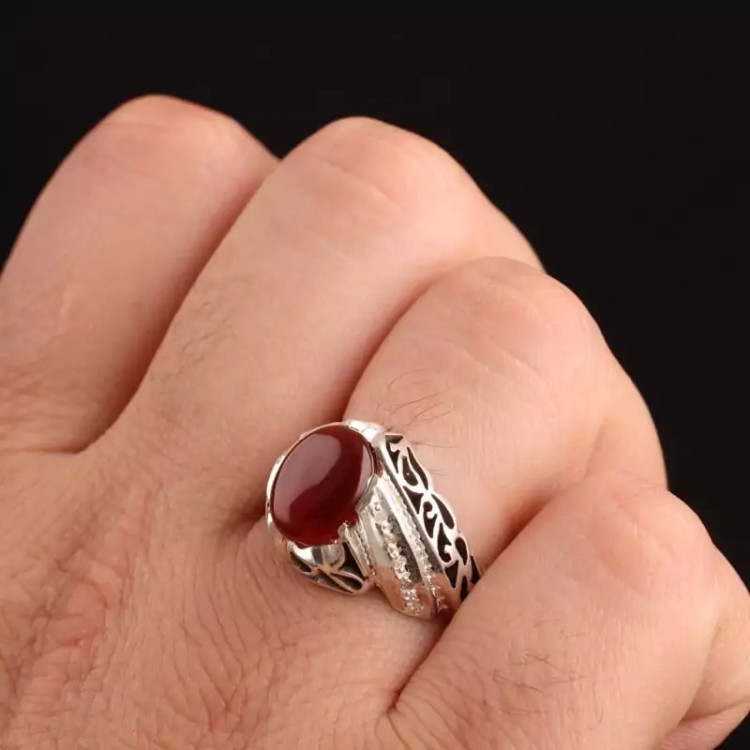 انگشتر نقره مردانه عقیق سرخ یمنی دستساز برلیان کاری شده اصل