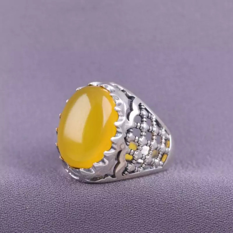 نگین این انگشتر زیبا عقیق زرد طبیعی اصل و مزین به حرز شرف الشمس می باشد.