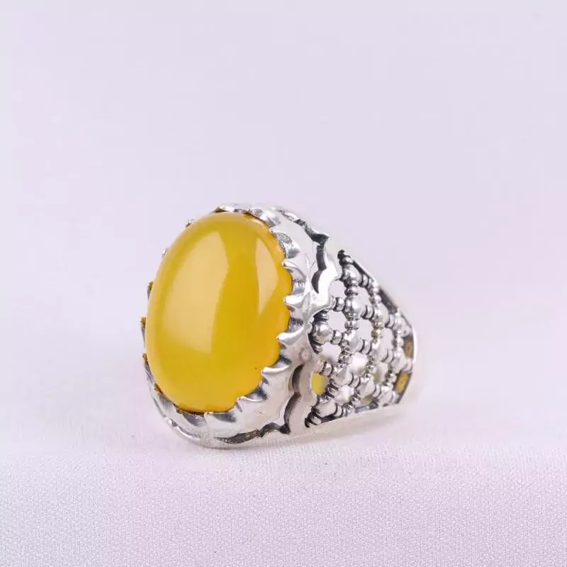 نگین این انگشتر زیبا عقیق زرد طبیعی اصل و مزین به حرز شرف الشمس می باشد.