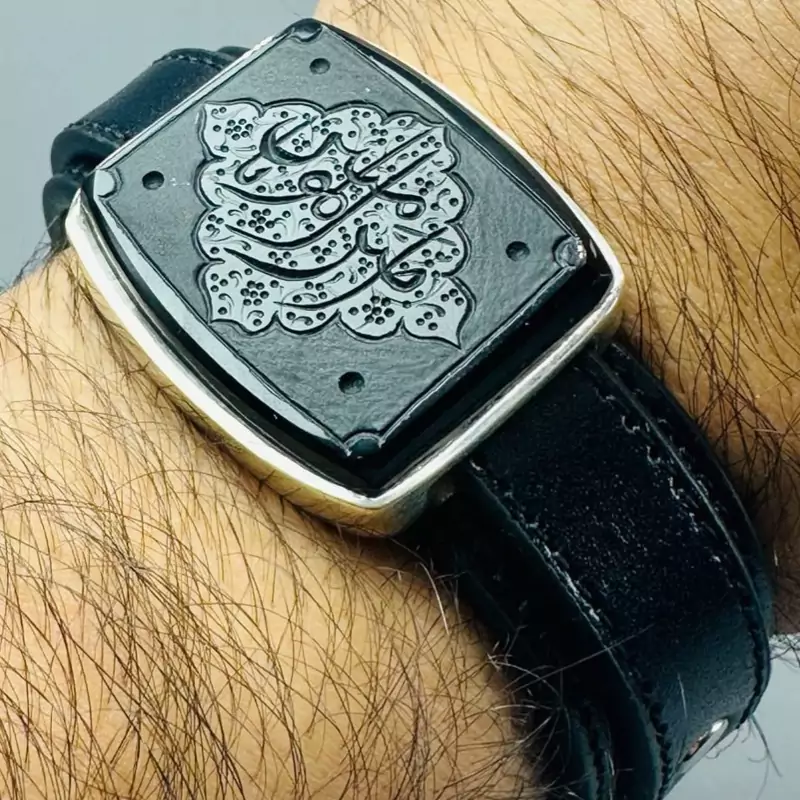 نگین دستبند عقیق مشکی اصل با نقش یا امیرالمومنین است که هم رنگ و هم نقش نگین قابل تغییر هست به سلیقه ی شما.