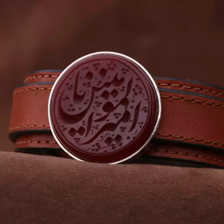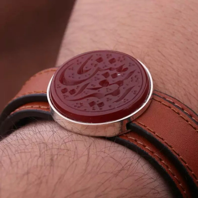 دستبند چرم طبیعی عقیق نقش یاامیرالمومنین اصل ( دستبند مردانه )