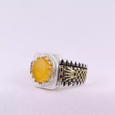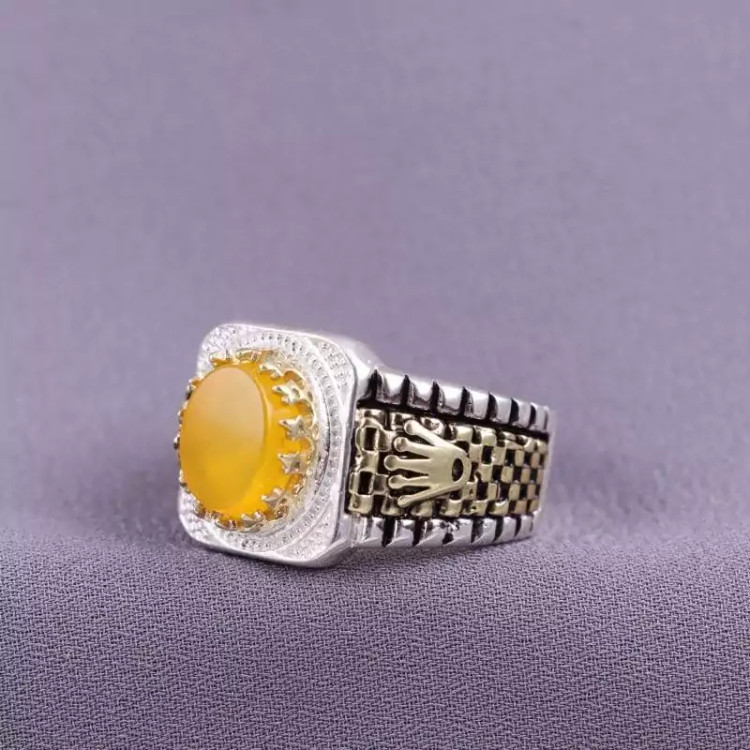 نگین این انگشتر زیبا عقیق زرد طبیعی اصل و مزین به حرز شرف الشمس می باشد.
