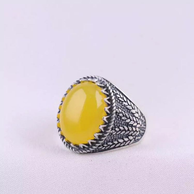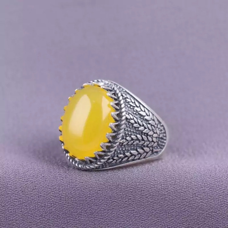 نگین این انگشتر زیبا عقیق زرد طبیعی اصل و مزین به حرز شرف الشمس می باشد.