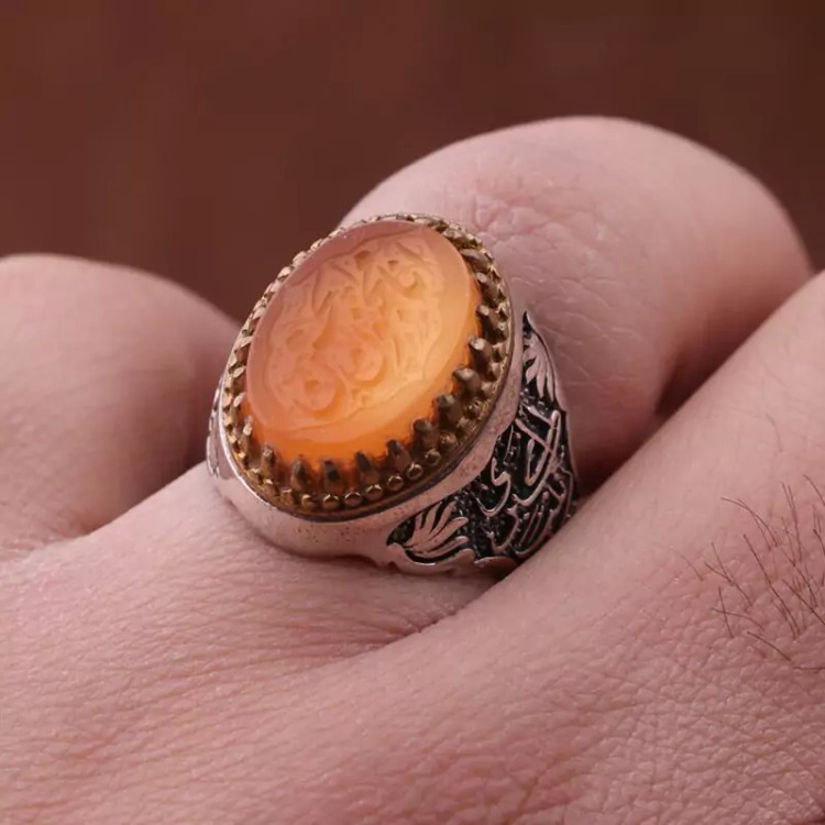 انگشتر عقیق یمنی پرتقالی نقش انا مجنون الحسین رکاب تاج برنجی مردانه اصل ( انگشتر مردانه )