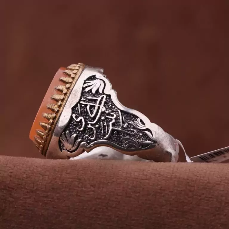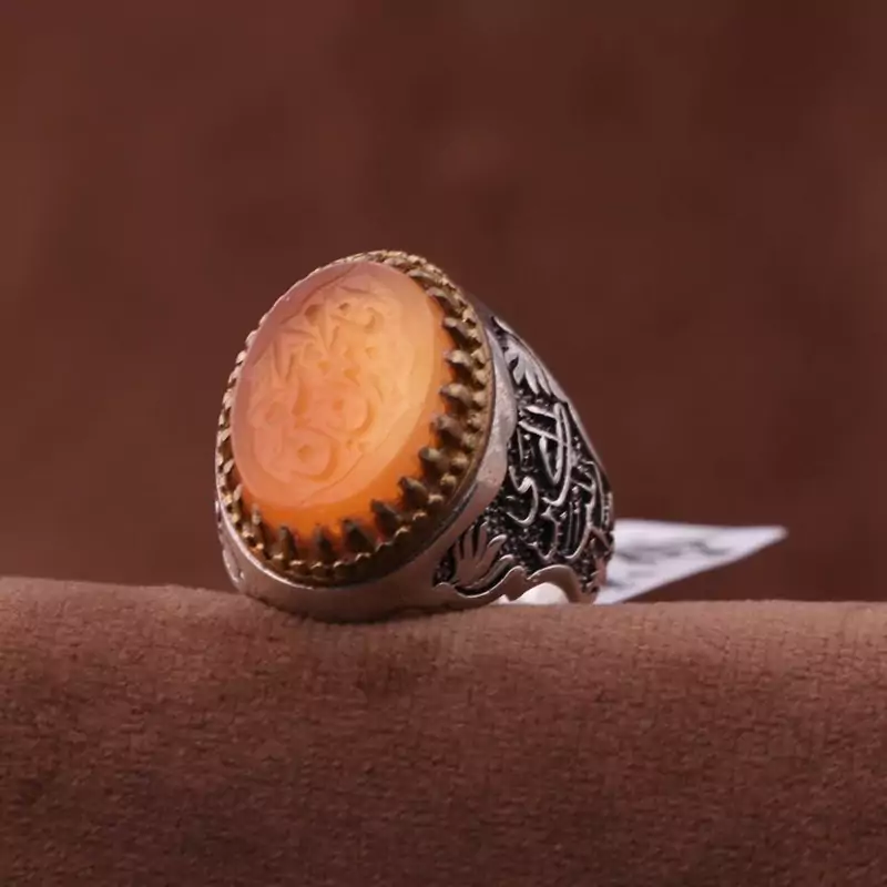 انگشتر عقیق یمنی پرتقالی نقش انا مجنون الحسین رکاب تاج برنجی مردانه اصل ( انگشتر مردانه )