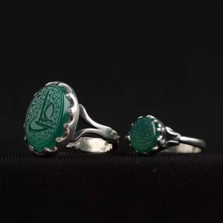 انگشتر نقره ست زنانه و مردانه عقیق سبز طبیعی نقش علی معلی