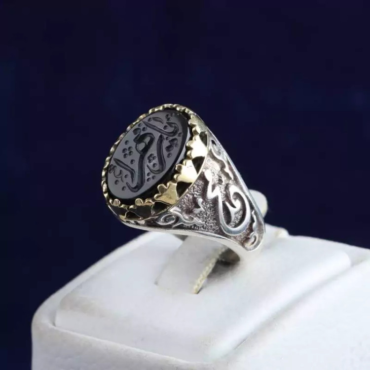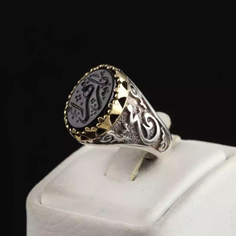 انگشتر نقره مردانه عقیق مشکی نقش یازهرا رکاب تاج برنجی اصل