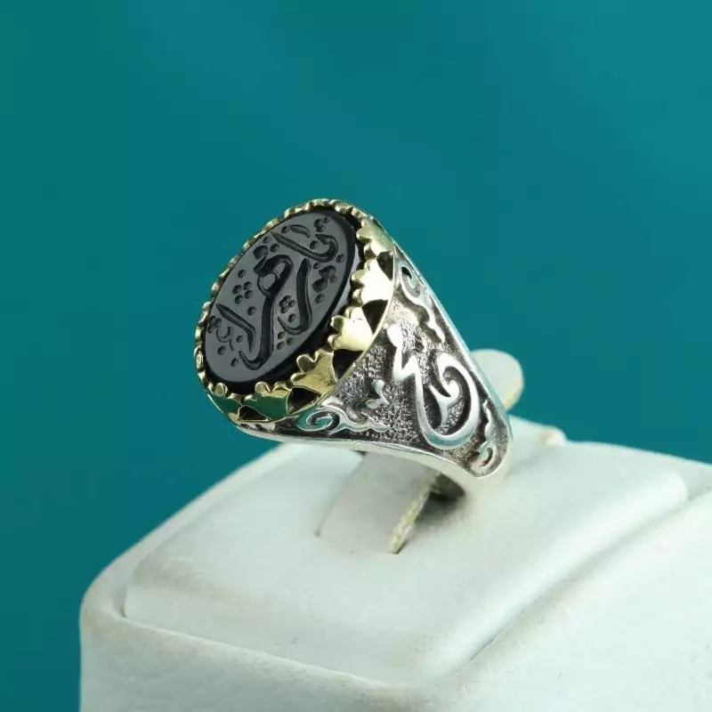 انگشتر نقره مردانه عقیق مشکی نقش یازهرا رکاب تاج برنجی اصل