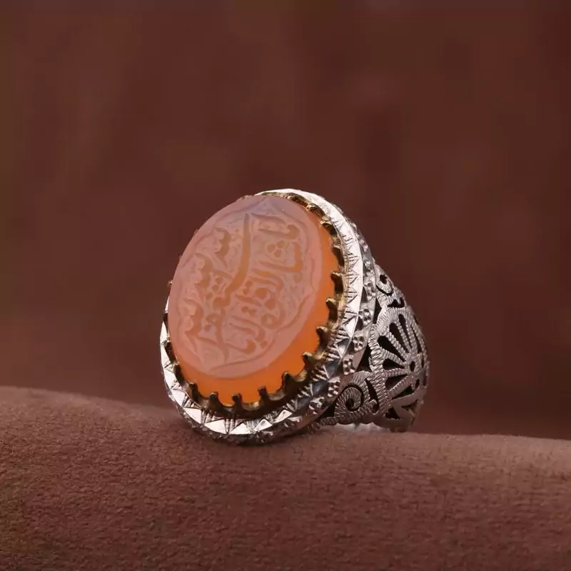 انگشتر عقیق یمنی سه نقش رکاب دستساز و تاج برنجی اصل ( انگشتر مردانه )