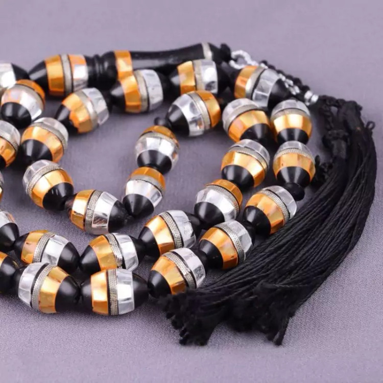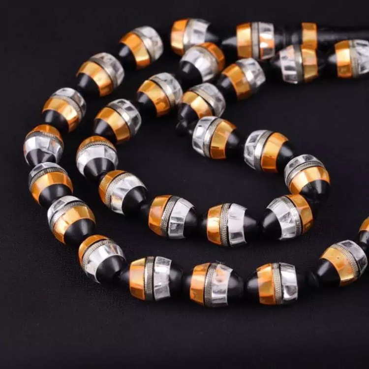 تسبیح زیبای چوب نارجین (کوک) که با صدف و کهربا مرصع کاری شده است.