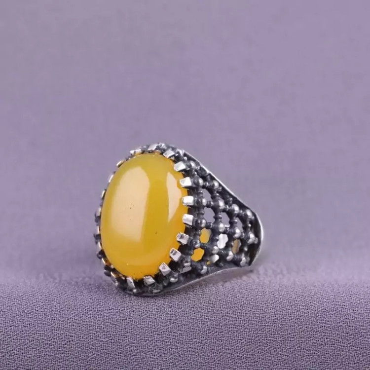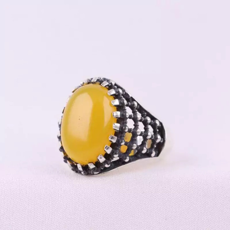 نگین این انگشتر زیبا عقیق زرد طبیعی اصل و مزین به حرز شرف الشمس می باشد.