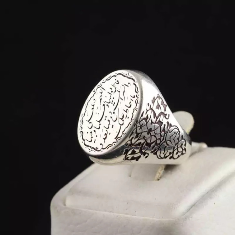 انگشتر تمام نقره مردانه زیبا و جذاب با نقش صلوات خاصه حضرت زهرا (س) تمام قلم زنی ( انگشتر نقره مردانه )