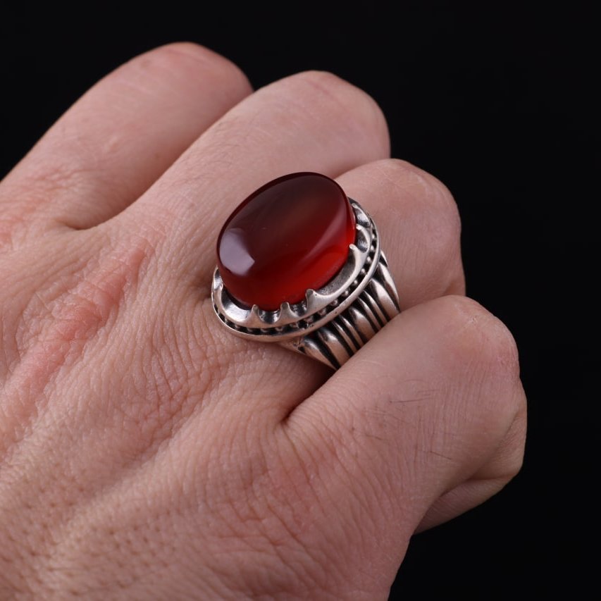 انگشتر نقره مردانه عقیق سرخ معدنی نگین درشت اصل ( انگشتر عقیق )