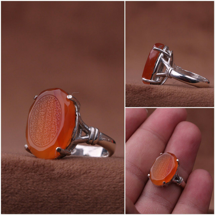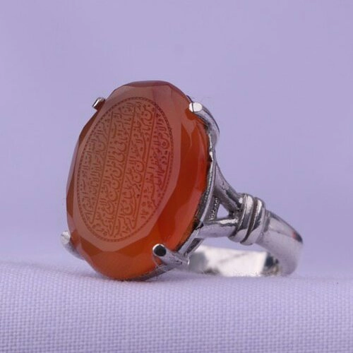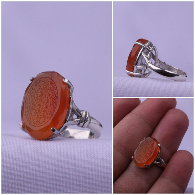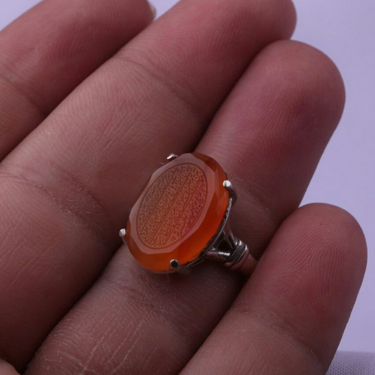 نگین انگشتر عقیق یمن اصل است که با آیه شریفه آیت الکرسی مزین گردیده است.