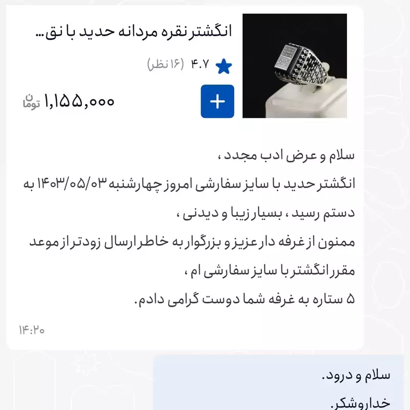 توجه: لطفا قبل از ثبت سفارش استعلام موجودی و هم چنین با توجه به نوسانات جهانی قیمت نقره ، لطفا حتما قبل از خرید استعلام قیمت بفرمایید،شاید قیمت پایین تر ، بالاتر و یا ثابت باشد.