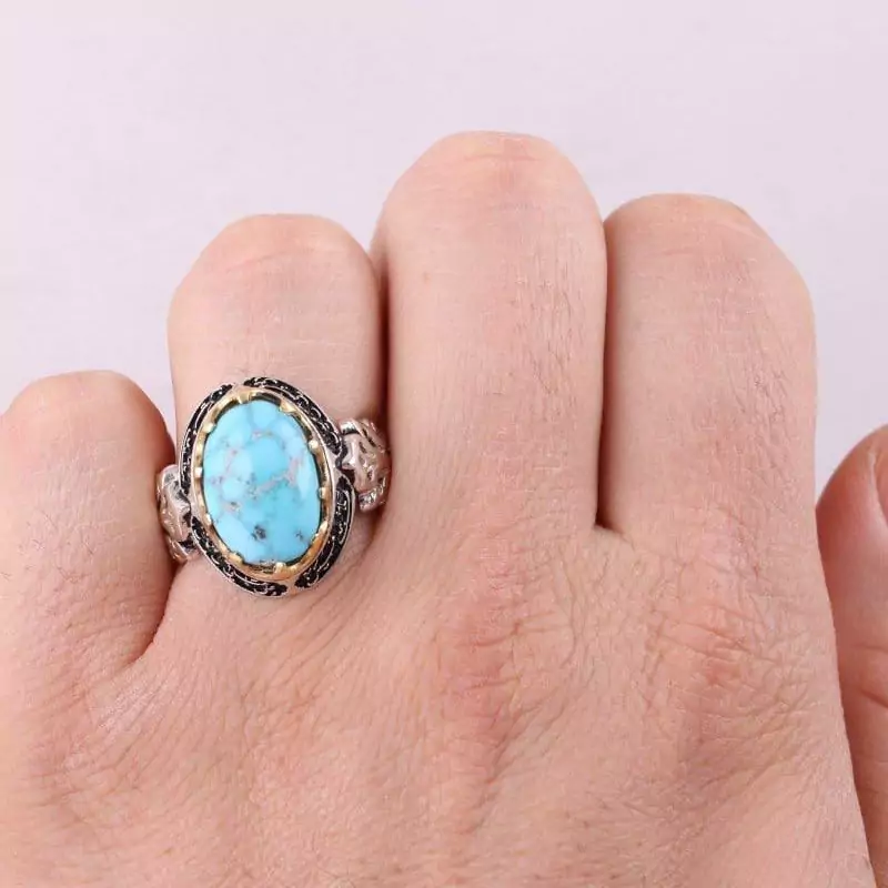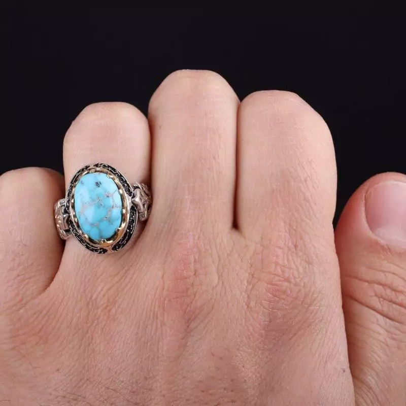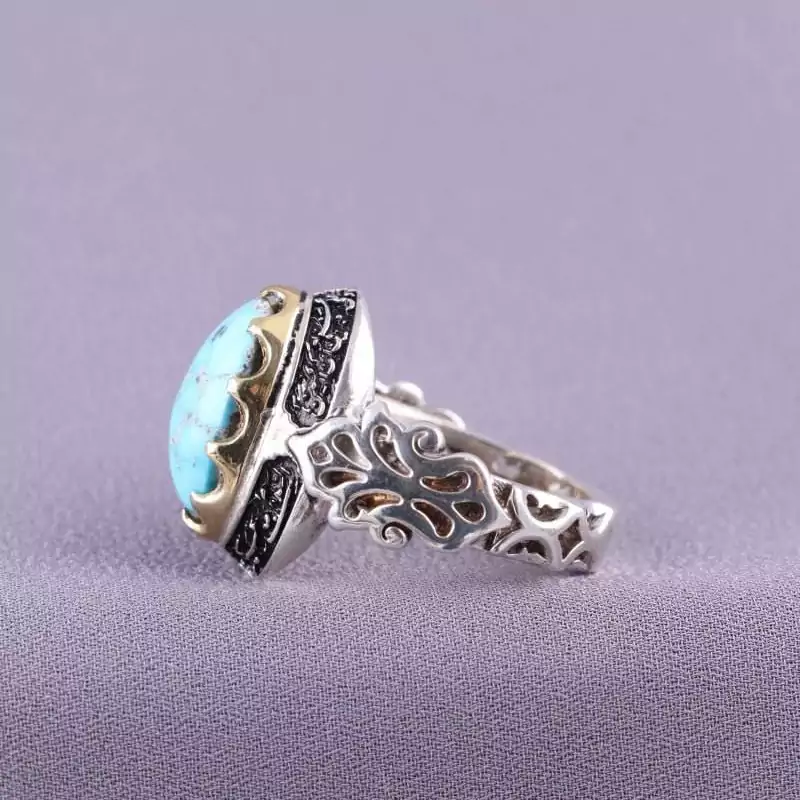 انگشتر مردانه فیروزه نیشابوری اصل دامله خوشرنگ قلمزنی