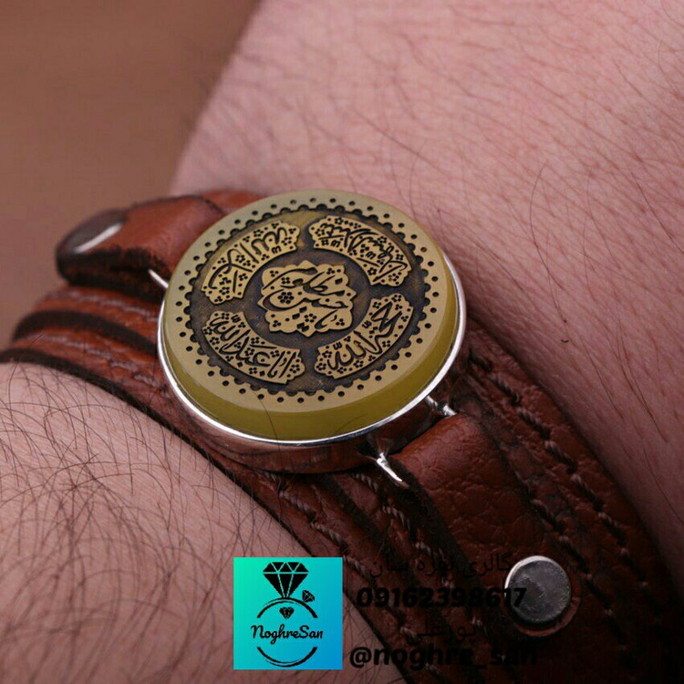 نگین دستبند عقیق زرد معدنی اصل با نقش ( یا حسین ) مظلوم در وسط و نقش های ( ثارالله ) و ( حجه الله ) و ( ابا عبدالله ) و ( سیدالشهدا ) در دورتا دور میباشد.