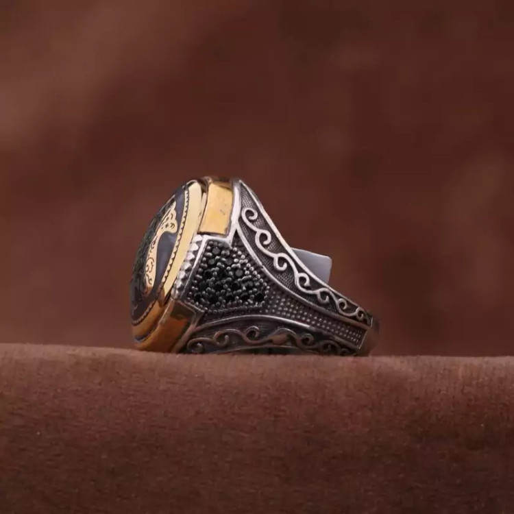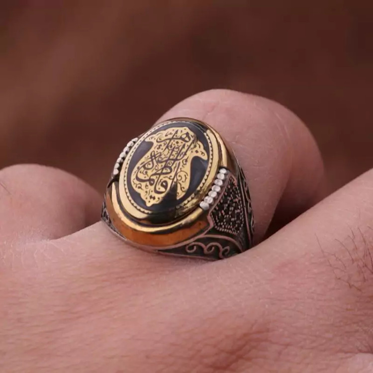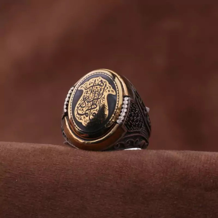 انگشتر حدید روکش برنجی طراحی زیبای نقش یافاطمه الزهرا اصل ( انگشتر مردانه )