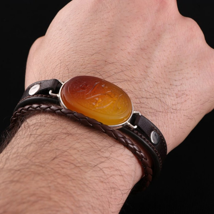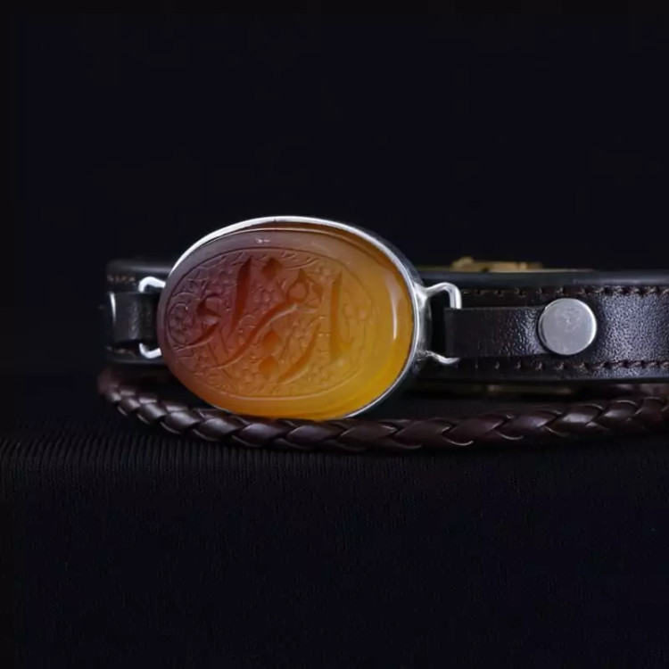 دستبند چرم طبیعی گاوی عقیق نقش یازهرا اصل ( دستبند مردانه )