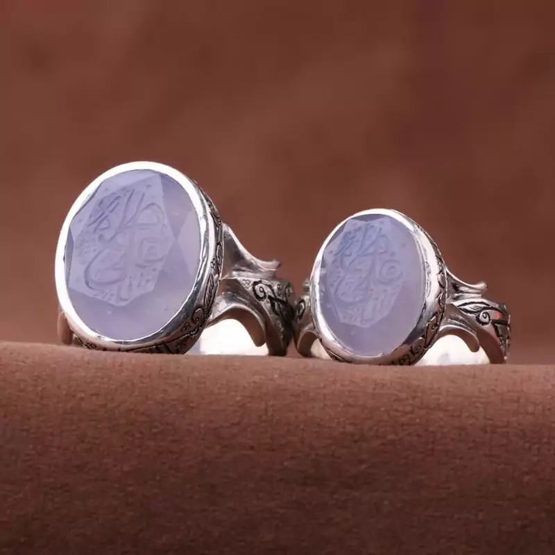 انگشتر عقیق کبود یمنی خطی نقش یافاطمه و یاعلی ، رکاب و قلمزنی دستساز اصل ( انگشتر ست عقیق )