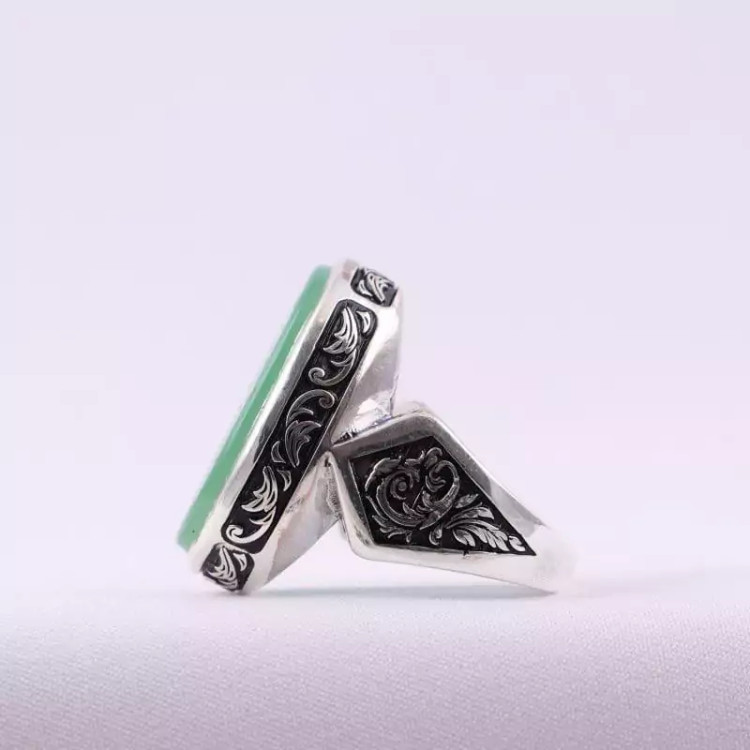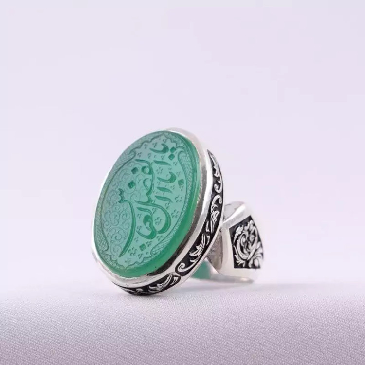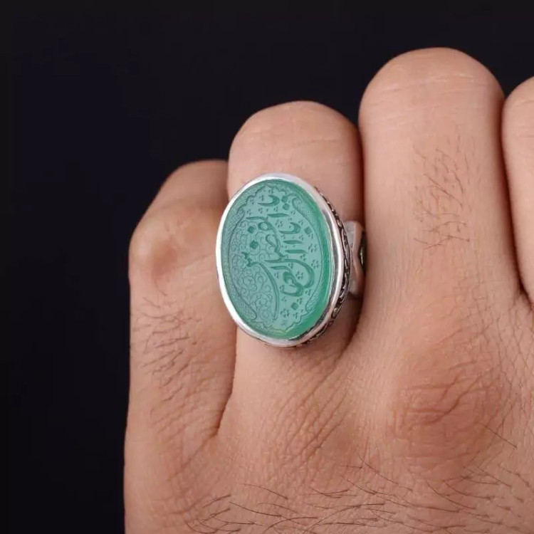 انگشتر نقره مردانه عقیق سبز یا اباالفضل العباس قلمزنی لیزر