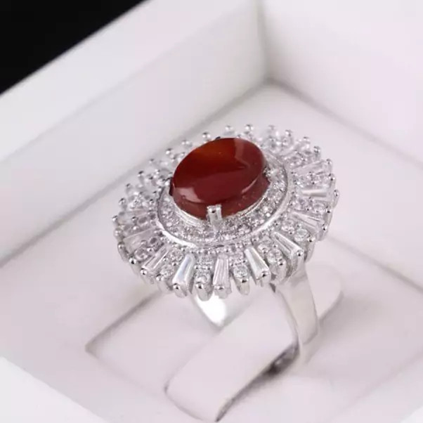 نگین این انگشتر زیبا و جواهری عقیق یمنی سرخ اصل است.