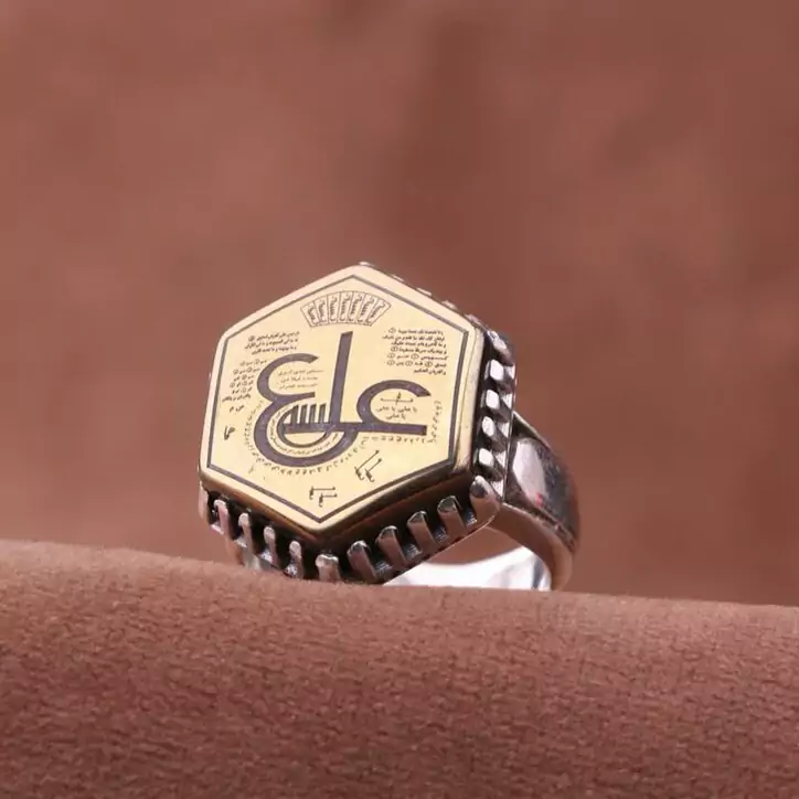 انگشتر حدید شیش ضلعی روکش برنجی نقش عین علی مردانه اصل ( انگشتر مردانه )