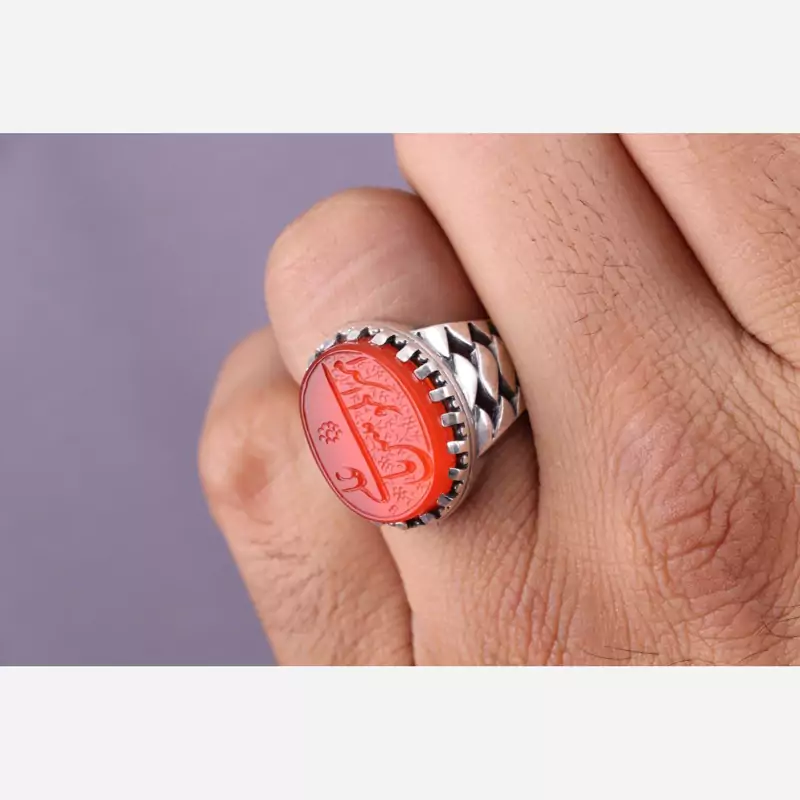 نگین آن عقیق پرتقالی اصل خراسانی و بسیار شفاف و خوشرنگ با نقش یا علی امیرالمومنین با خط درجه یک است.