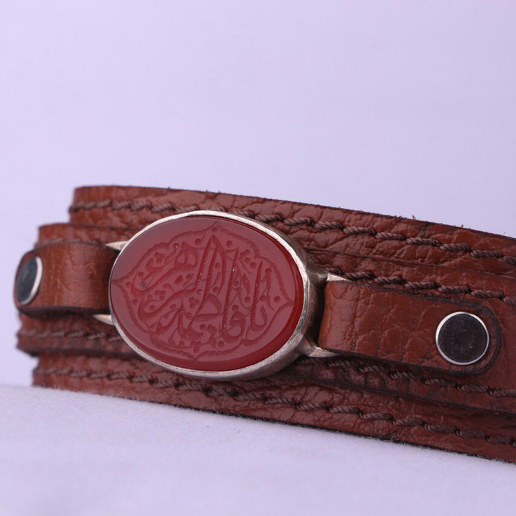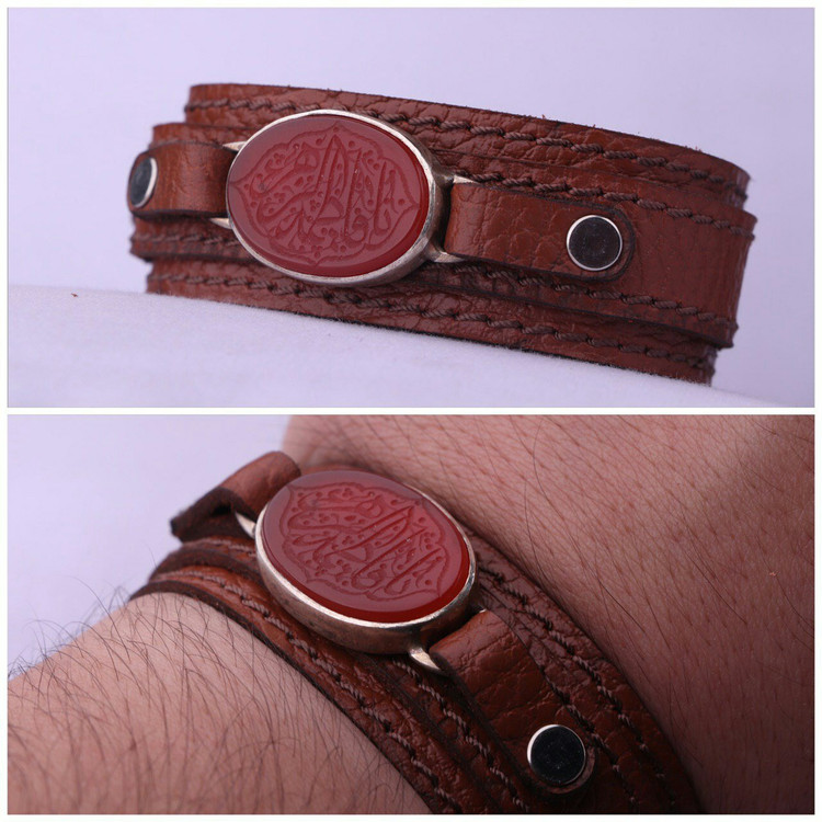 دستبند چرم گاوی طبیعی نگین عقیق خطی