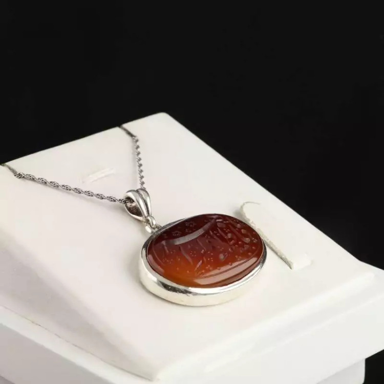 مدال نقره مردانه دستساز عقیق خراسانی اصل با نقش یا فاطمه الزهرا ( گردنبند عقیق )