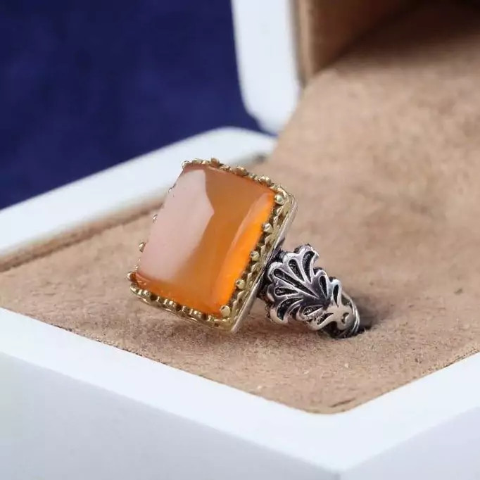 انگشتر نقره مردانه عقیق یمنی رکاب تاج برنجی مستطیل اصل