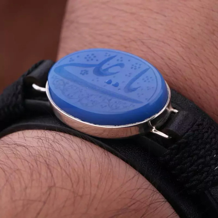 دستبند چرم طبیعی عقیق آبی یاعلی اصل ( دستبند مردانه )