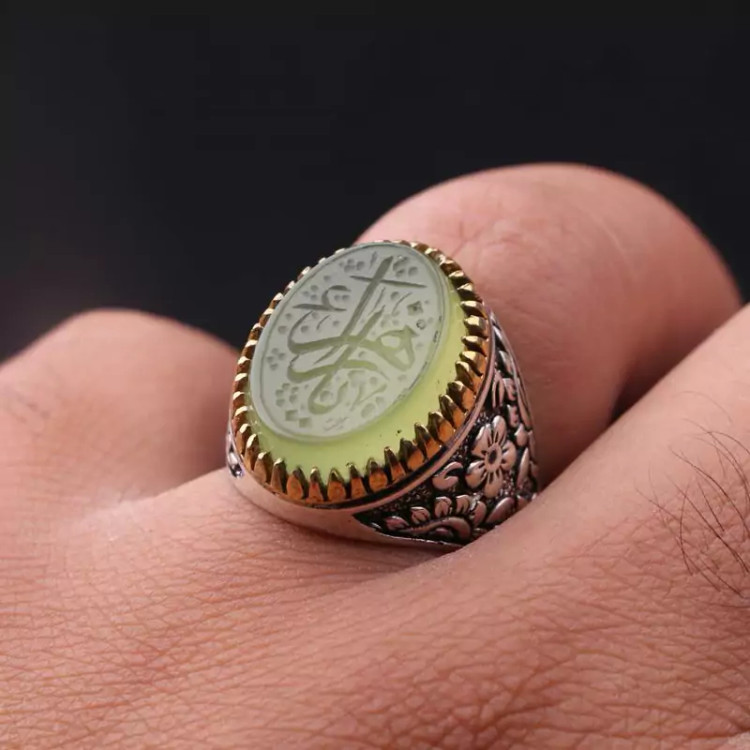 انگشتر عقیق سبز رکاب تاج برنجی نقش یازهرا اصل ( انگشتر مردانه )