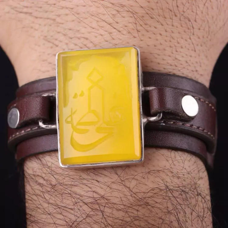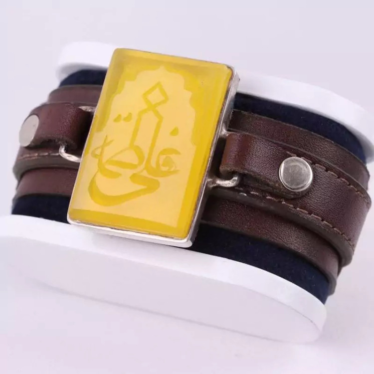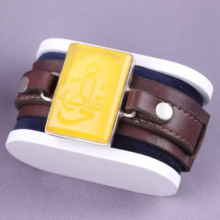 دستبند چرم طبیعی گاوی نقره عقیق اصل نقش علی فاطمه