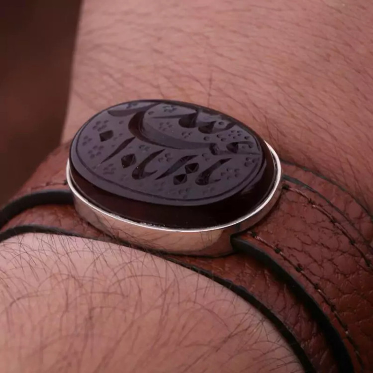 دستبند چرم طبیعی عقیق خراسان نقش یااباعبدالله اصل ( دستبند مردانه )
