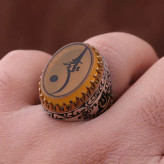 انگشتر عقیق زرد نقش خاص حسین رکاب تاج برنجی و منقش مردانه اصل ( انگشتر مردانه )