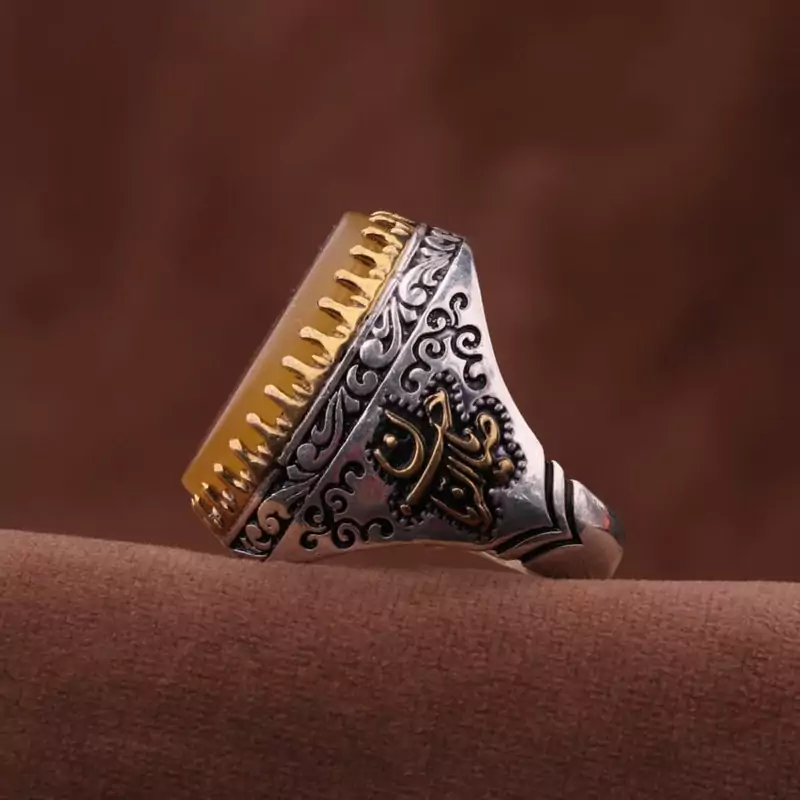 انگشتر عقیق زرد نقش خاص حسین رکاب تاج برنجی و منقش مردانه اصل ( انگشتر مردانه )