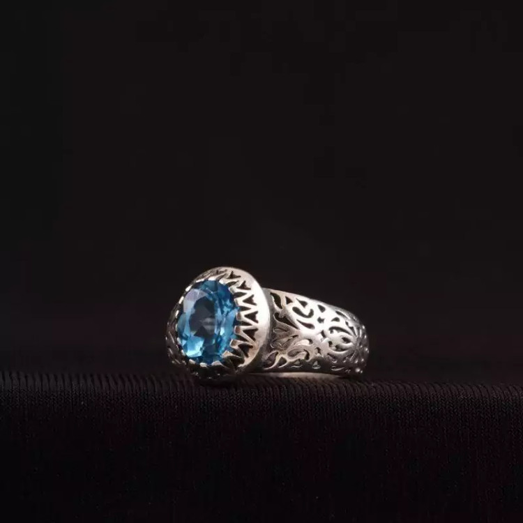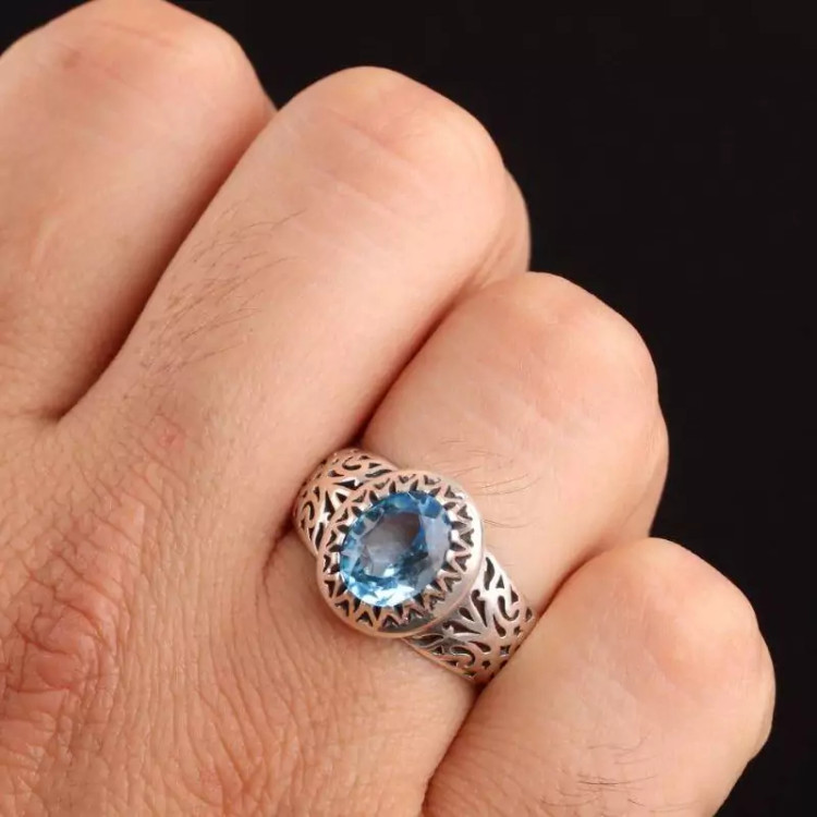 انگشتر نقره مردانه دستساز توپاز سوئیسی اصل رکاب شبکه ای