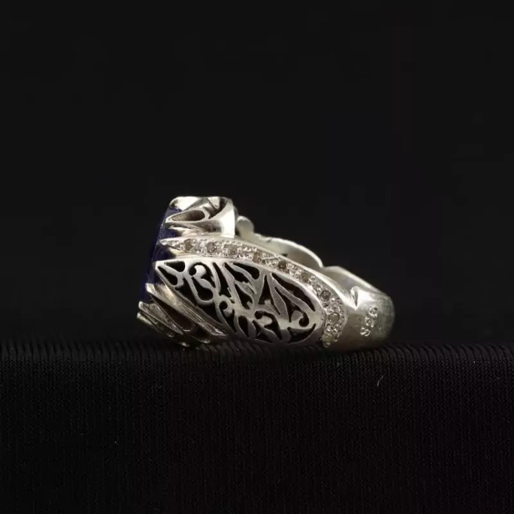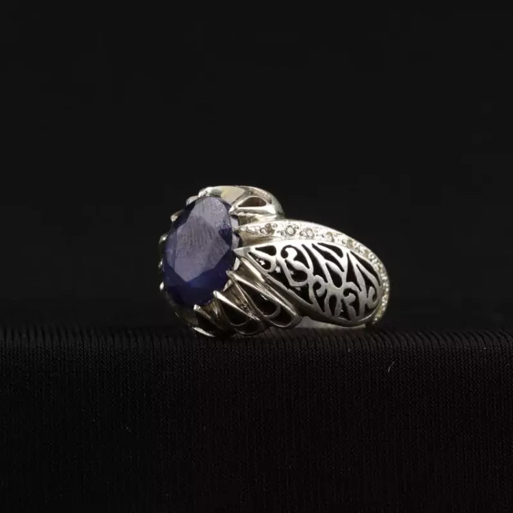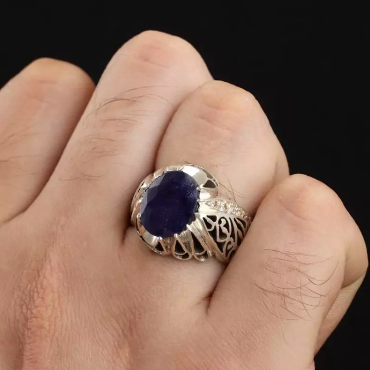 انگشتر نقره مردانه دستساز یاقوت کبود اصل 20 عدد مخراجکاری برلیان اصل