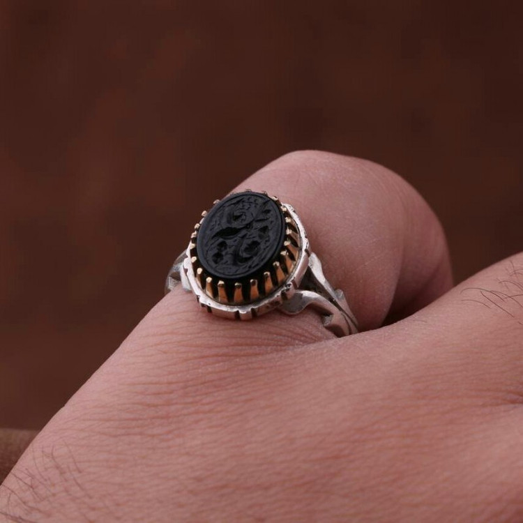 انگشتر نقره مردانه عقیق مشکی تاج برنجی نقش یافاطمه اصل ( انگشتر عقیق )