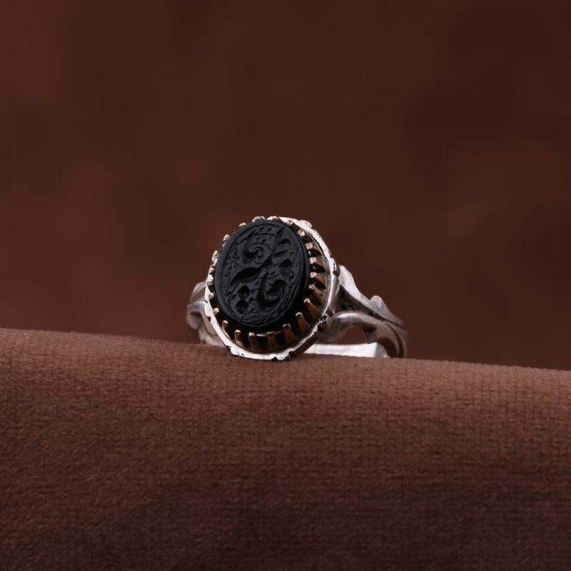 انگشتر نقره مردانه عقیق مشکی تاج برنجی نقش یافاطمه اصل ( انگشتر عقیق )