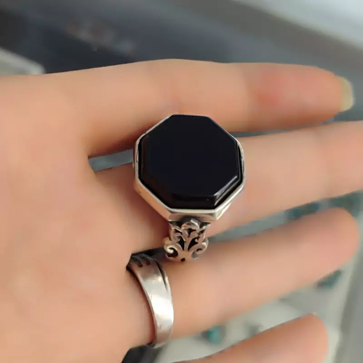 انگشتر عقیق سیاه اصلی هشت ضلعی مدل گل