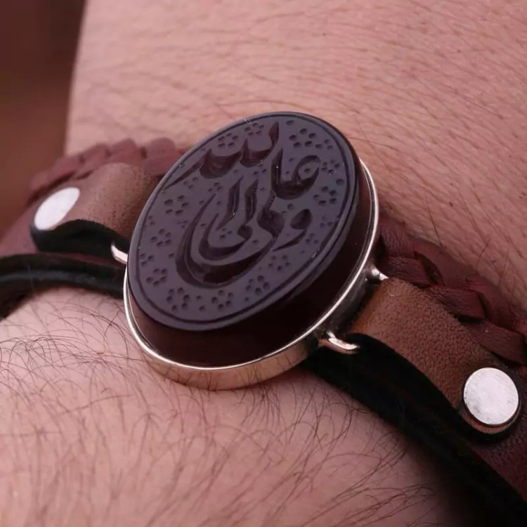 دستبند چرم طبیعی عقیق نقش علی ولی الله مردانه اصل ( دستبند مردانه )