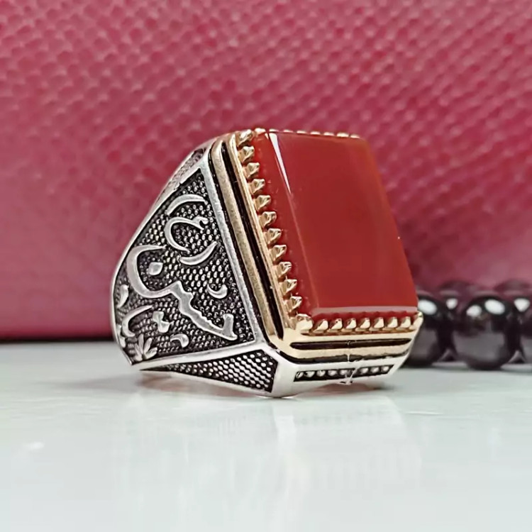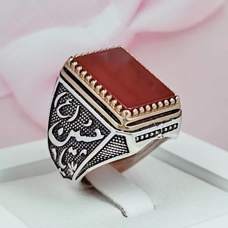 انگشتر یاحسین مردانه عقیق سرخ چهارگوش